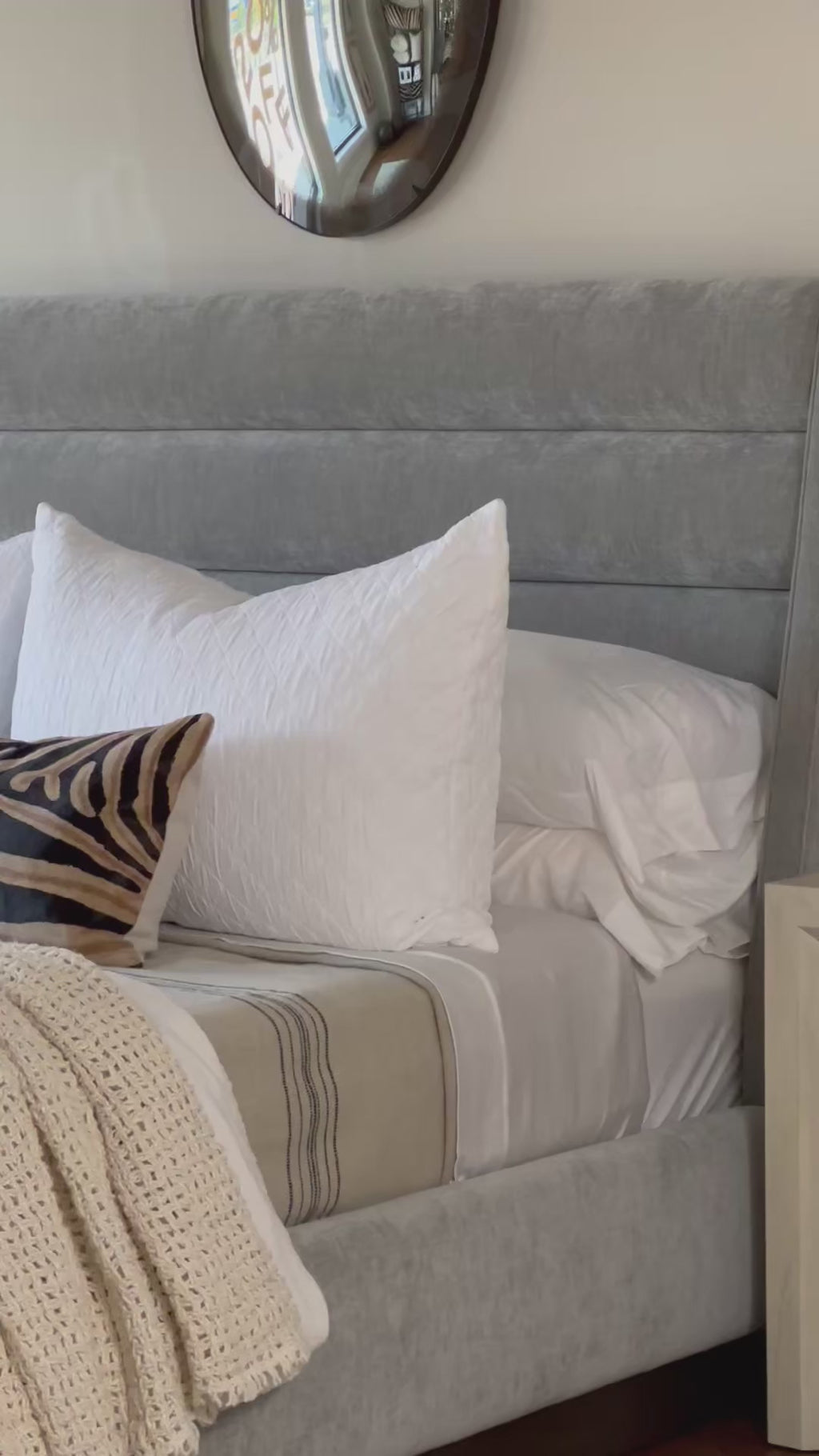 The Frankie Bed is such a beautiful and transitional piece that looks and feels so luxurious— The light grey upholstery is so soft and the perfect shade, the rolled back is so cozy, and it the winged sides pull it all together in the most elegant way. This bed is so lovely!