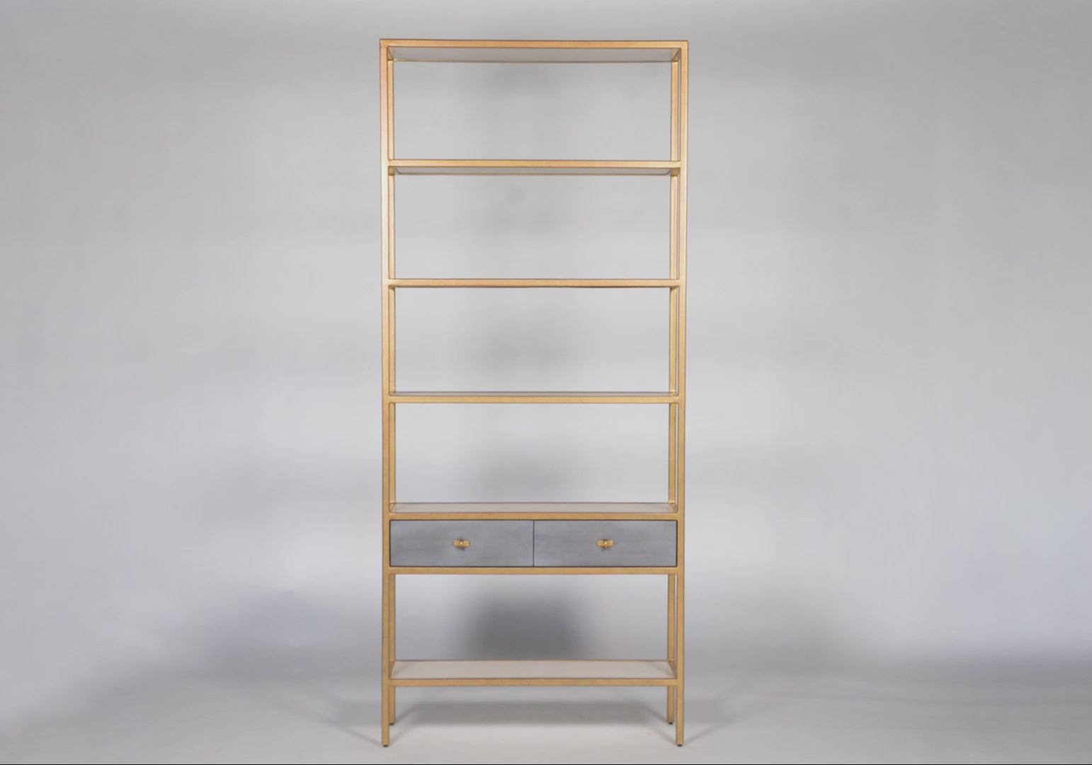 The Albert Etagere is a handsome addition with its tall, antique brass finished frame beautifully contrasted by five white wood shelves. Two gun-metal colored drawers provide hidden storage, complimented by brass finger-pull knobs. Its functional and tasteful design styles effortlessly in closets, bathrooms, bedrooms, and living rooms.
