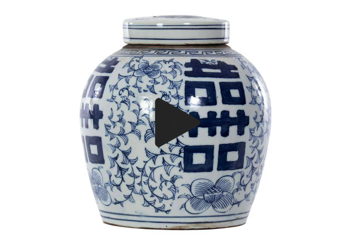 Create a tasteful, cultured look with this rounded temple jar. It boasts large painted symbols offset by delicate flowers, intricate stems, and lined patterns. Its traditional blue and white coloring styles beautifully with faux stems and greenery, lending a fresh, versatile design.