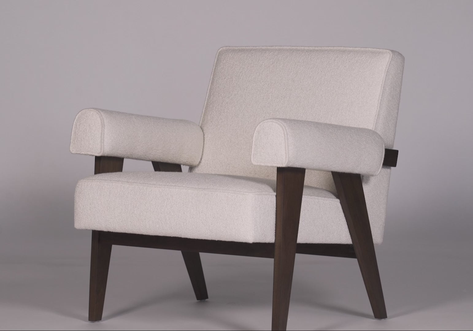 I love how this chair is a stylish, modern addition to any space, with a clean design that fits well in contemporary or mid-century interiors. The white boucle upholstery contrasts beautifully with the dark wooden legs. It's well-padded for comfort, with supportive armrests and a sturdy build. Perfect for living rooms, offices, or reading nooks, it combines comfort with visual appeal.