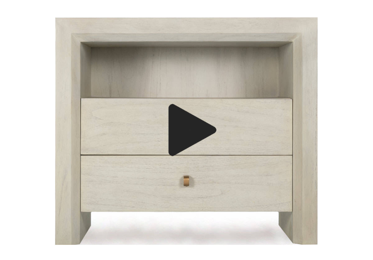 Scaled for smaller spaces, the Millie features a waterfall design, beveled edge details, and mitered corners that wrap the top and continue to the floor. Its open shelving provides visible storage and easy styling, complemented by two drawers that boast curved brass hardware. Available in a rich hazelnut or a fresh cloud finish to complete its sophisticated look.