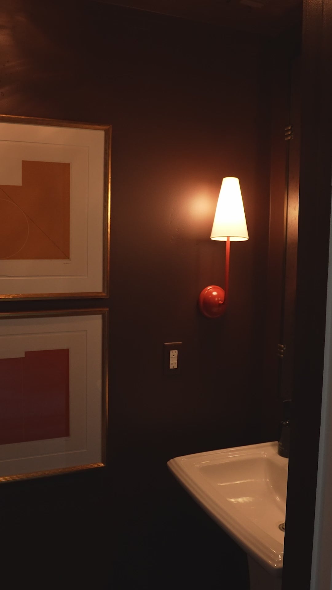 The Maude Sconce features an irresistible red base paired with a tall, tapered linen shade for a refined balance of color and form. Its slender silhouette makes a striking statement styled above a mantle, beside a mirror, or along a hallway, bringing warmth and quiet drama to any space.