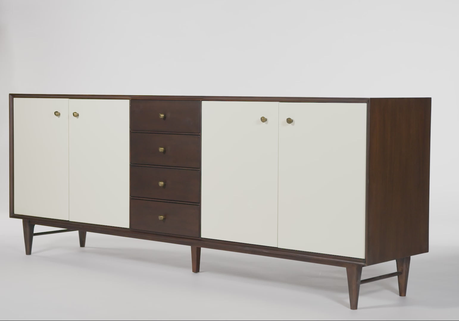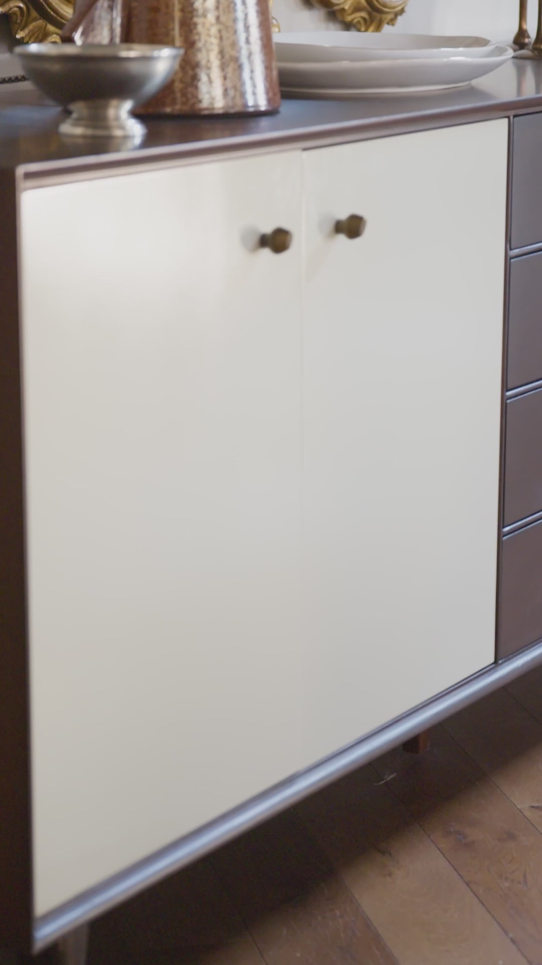 The Frances Sideboard gives an elevated, mid-century feel with its contrasting two-tone design. The beautiful bone doors against the dark, mahogany box and center drawers add a chic elegance, easily becoming the focal point in any room. Organic-shaped bronzed knobs provide additional dimension complemented by ample hidden storage. Style in a living room, dining room, office, or bedroom for a one-of-a-kind design.