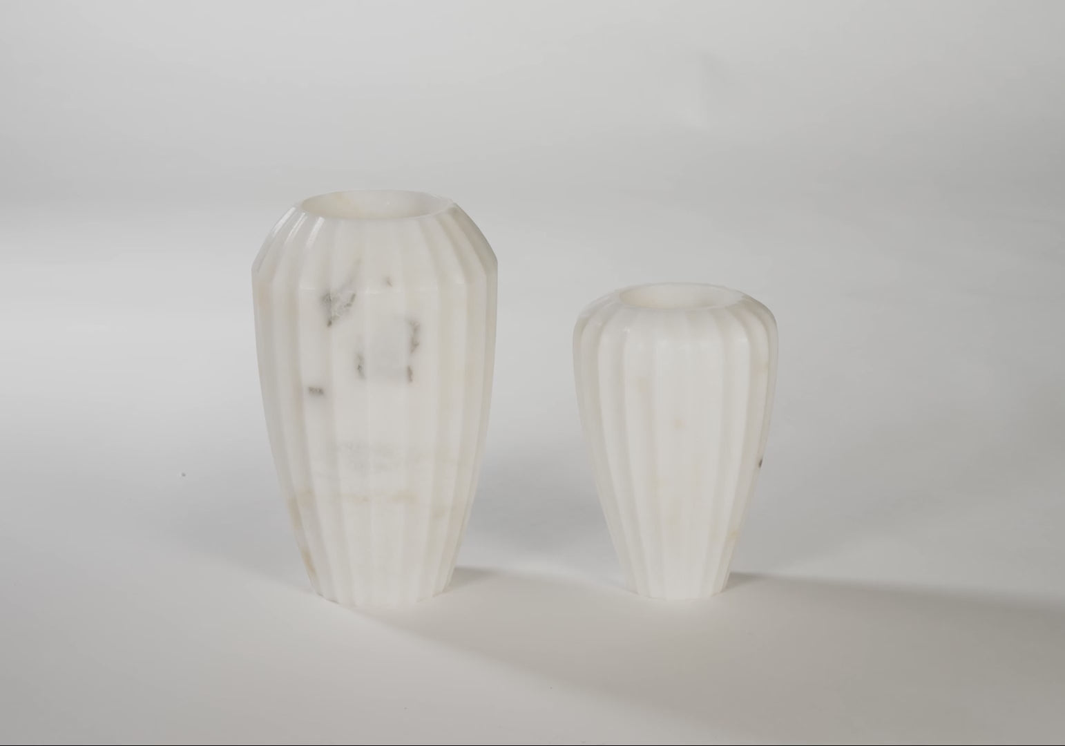 The Flora is an eye-catching vase with its subtle ribbed design crafted entirely from white marble. Its distinctive, natural marble pattern lends visual texture, for an effortlessly versatile piece. Available in two sizes, style one alone or pair both together for added height and refinement.