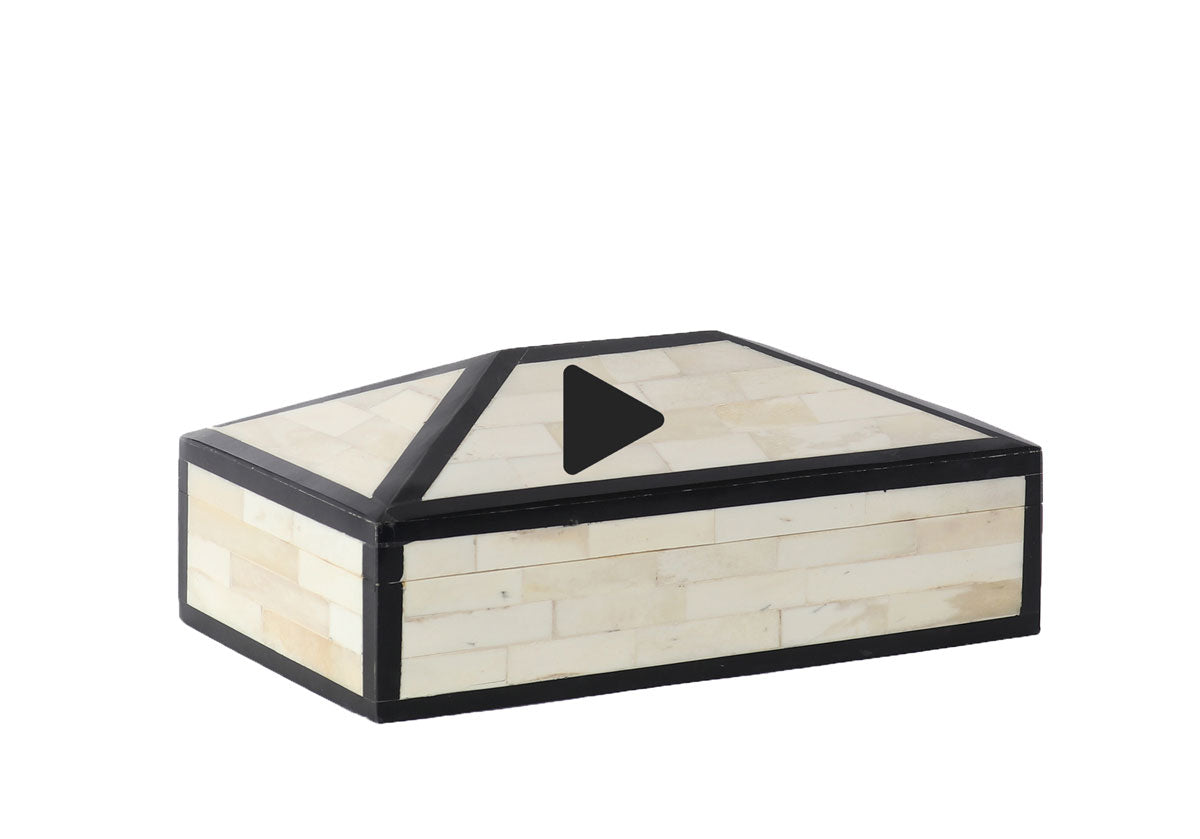 This striking box lends visual texture with its deep black border and natural bone design. Its peaked lid provides an additional touch of dimension, for a look that is refined and elegant.