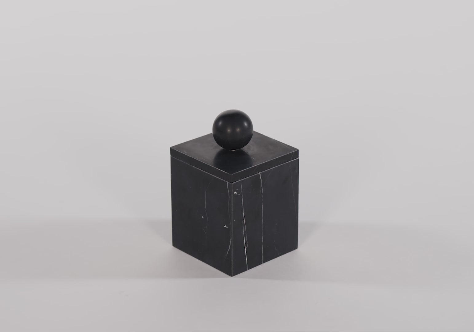 Entirely crafted from marble, this stunning box is a luxurious addition. Its petite size is contrasted by a thin lid and dark, rounded finial, for an added dimensional touch. Incredibly versatile, its natural veining lends visual texture and elegance, styling beautifully on consoles, coffee tables, and built-ins.