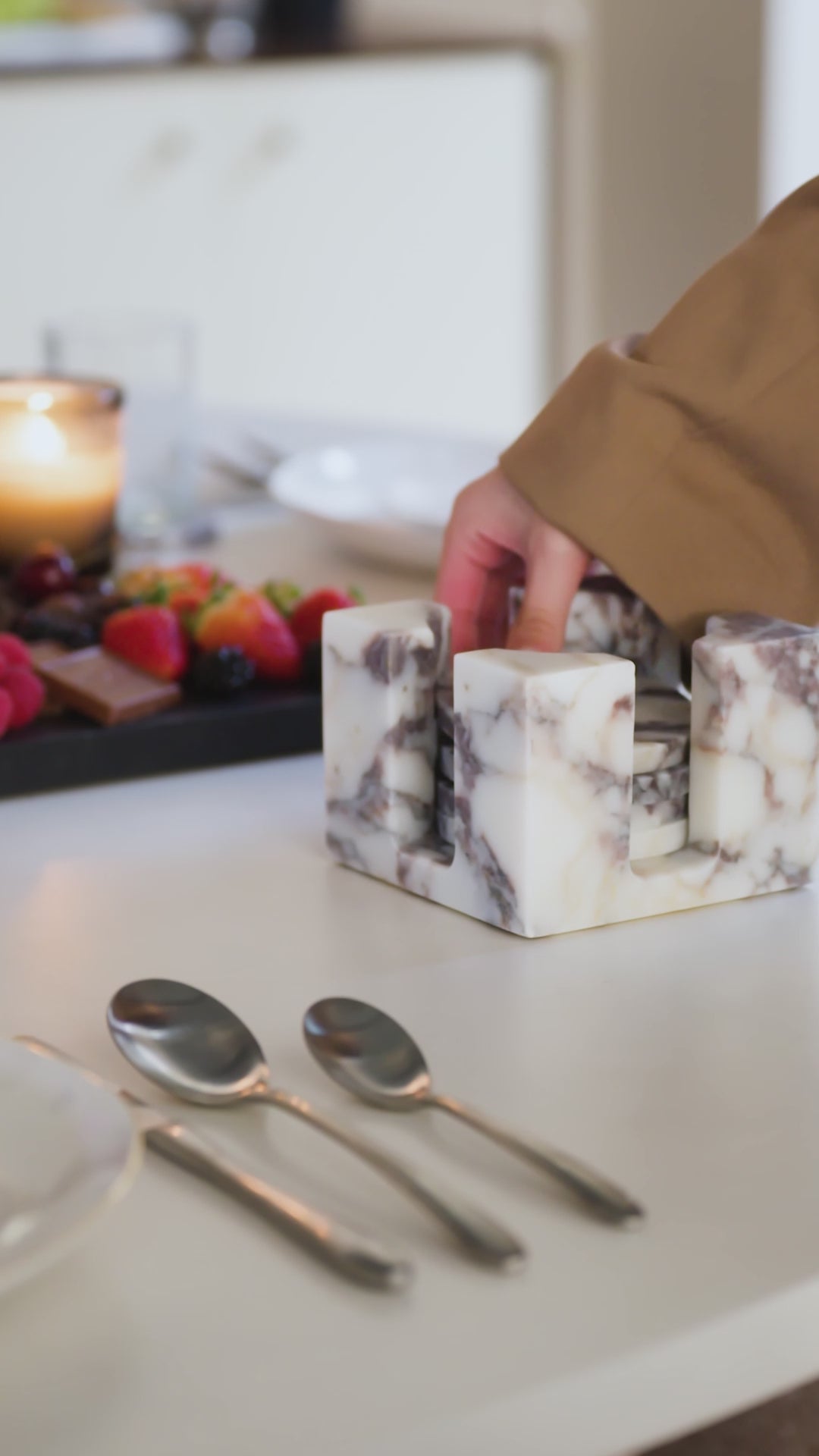 lifestyle photo of model holding marble coaster set in calacatta viola color. pictured with large dining table and decorated with candle stands, a lamp, and flowers.