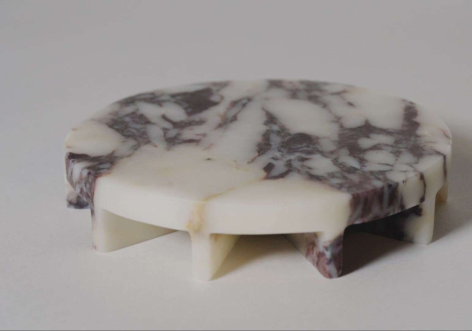 the dolce tray, a marble slab in Calacatta Viola. Elevated with 8 radius legs.