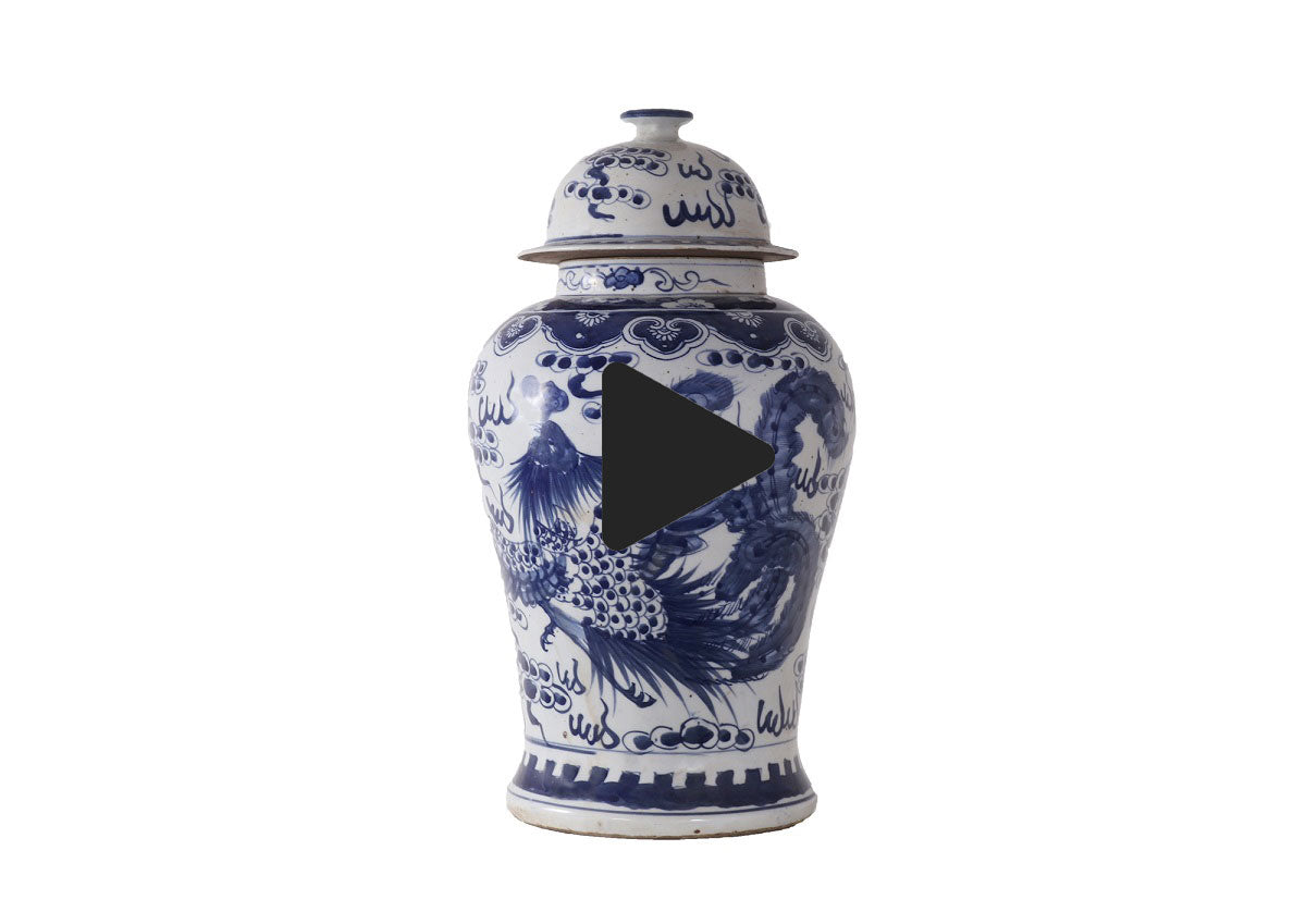 This striking temple jar features cobalt blue and white porcelain with an eye-catching pattern. Its timeless design easily styles as a focal point or paired with faux greenery.