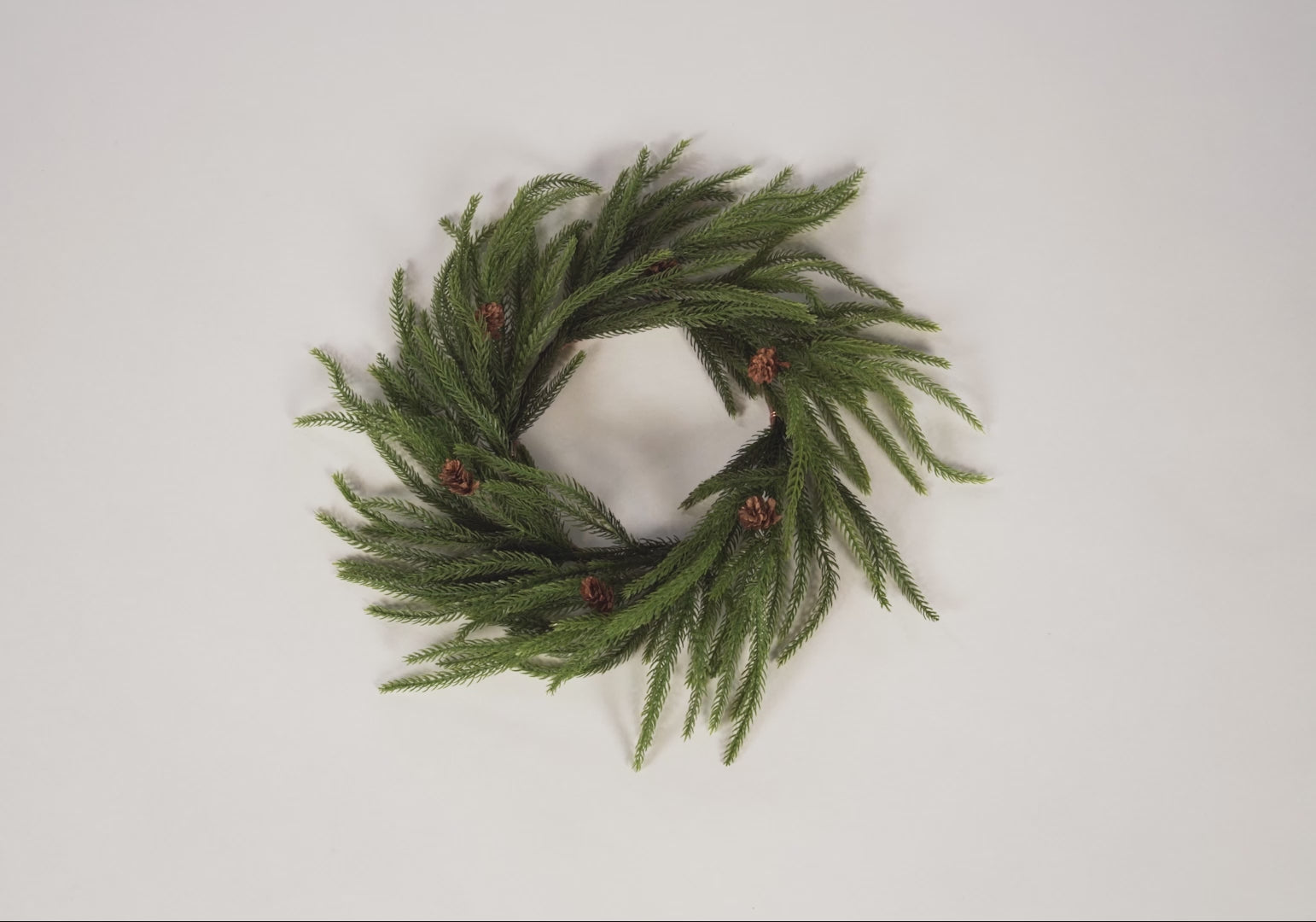 Petite and lifelike, this charming wreath features green pines with nestled small-scaled pinecones. Its tasteful design styles well on the back of chairs, diningscapes, and console tables for a tasteful, seasonal touch.