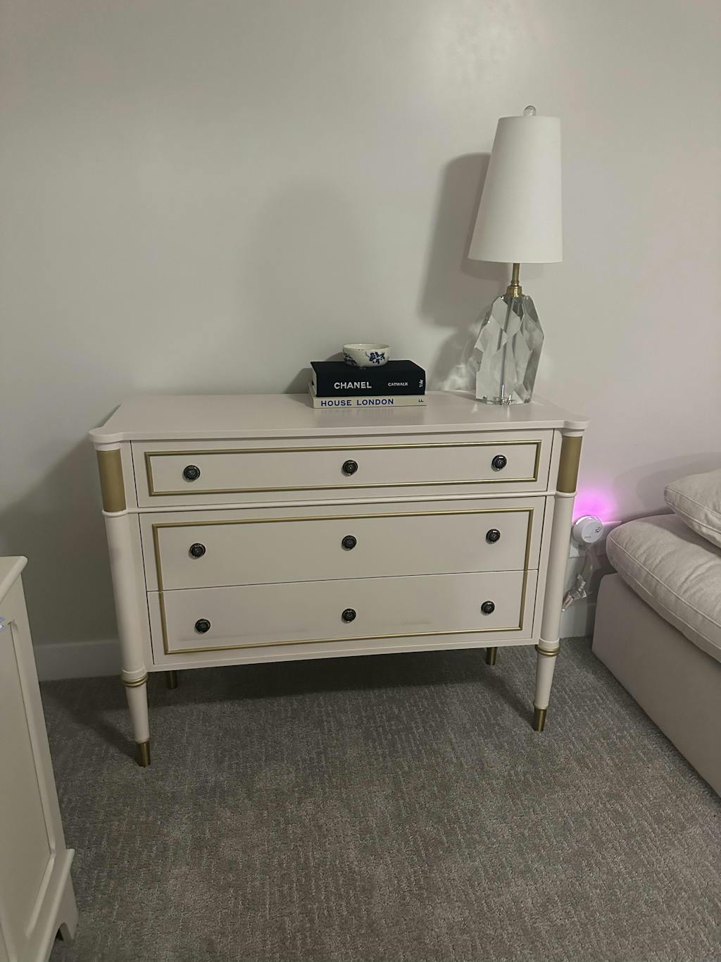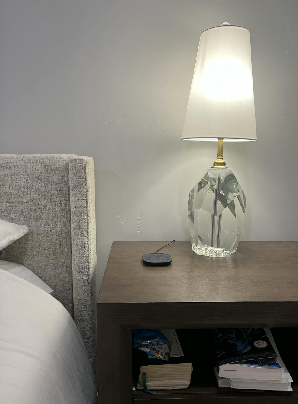 two crystal cubes sit on a glass side table, with a crystal lamp and blush pink book display.