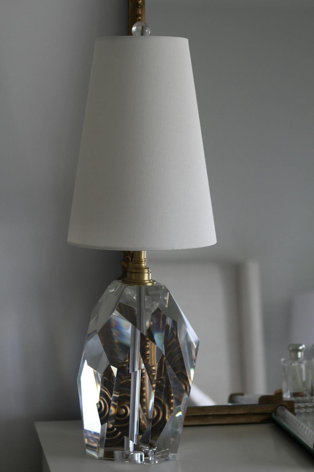 This lamp features a asymmetrical faceted solid K1 crystal base with brass hardware and a beautiful, delicate tall line. Its elongated tapered linen shade casts a bright glow, highlighting its eye-catching form.
