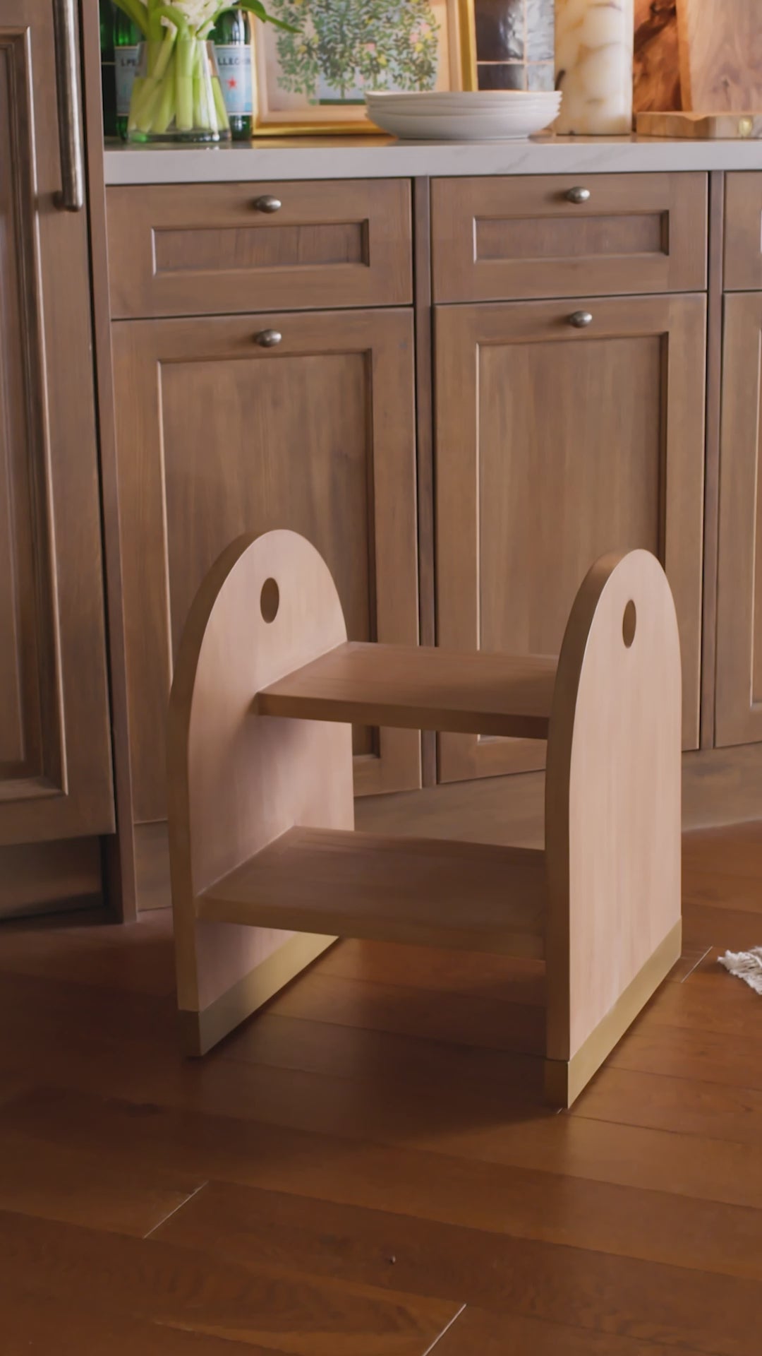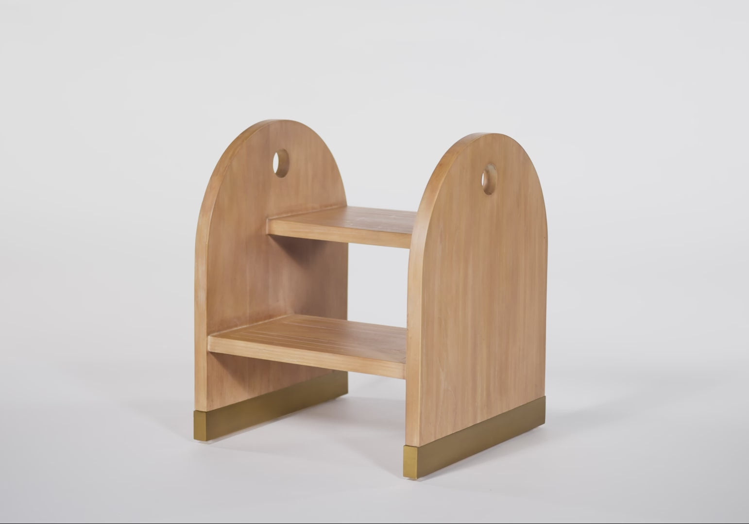 side of the odette, This step stool is the ideal balance of function and sophistication. Its beautifully rounded wood form, complemented by its two brass capped sled base and matching hardware, blends seamlessly into closets, pantries, kid's baths, and kitchens. Its elegant design styles effortlessly for a timeless, elevated look.