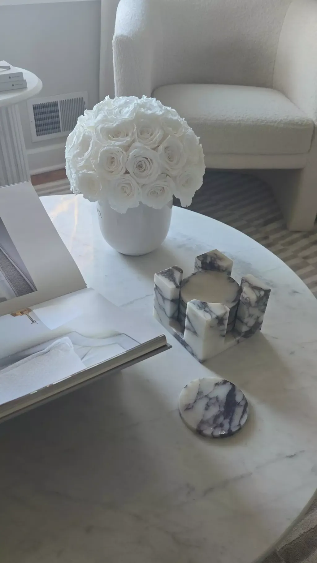 calacatta viola marble coaster set shown in lifestyle photo on coffee table.