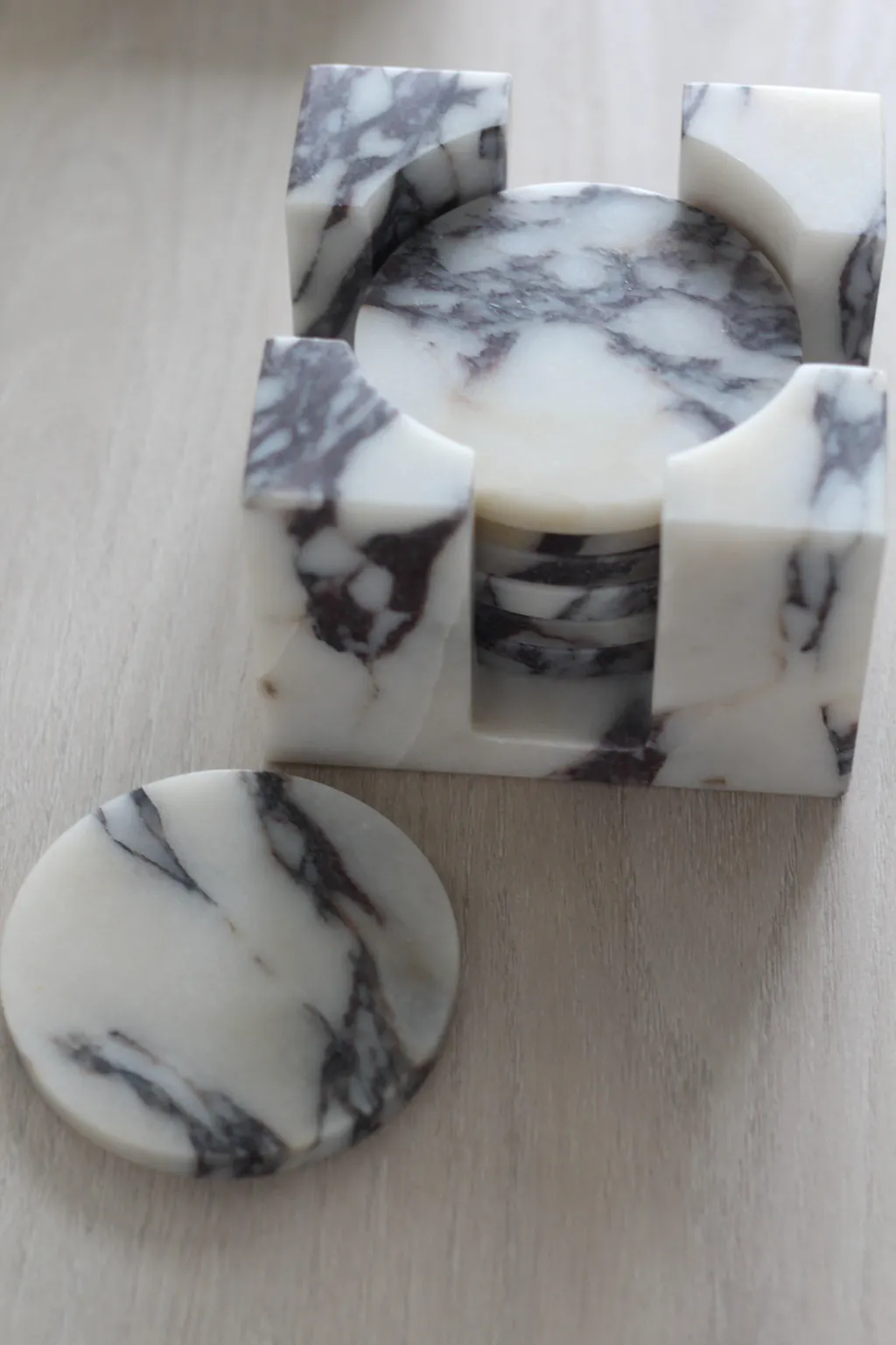 Carved from the finest marble slabs of Calacatta Viola, this stunning coaster set features incredible natural veining. Its visually textured design gives a timeless, organic look styling effortlessly on coffee tables, console tables, and kitchen counters. Sold as a set of a holder and seven coasters.