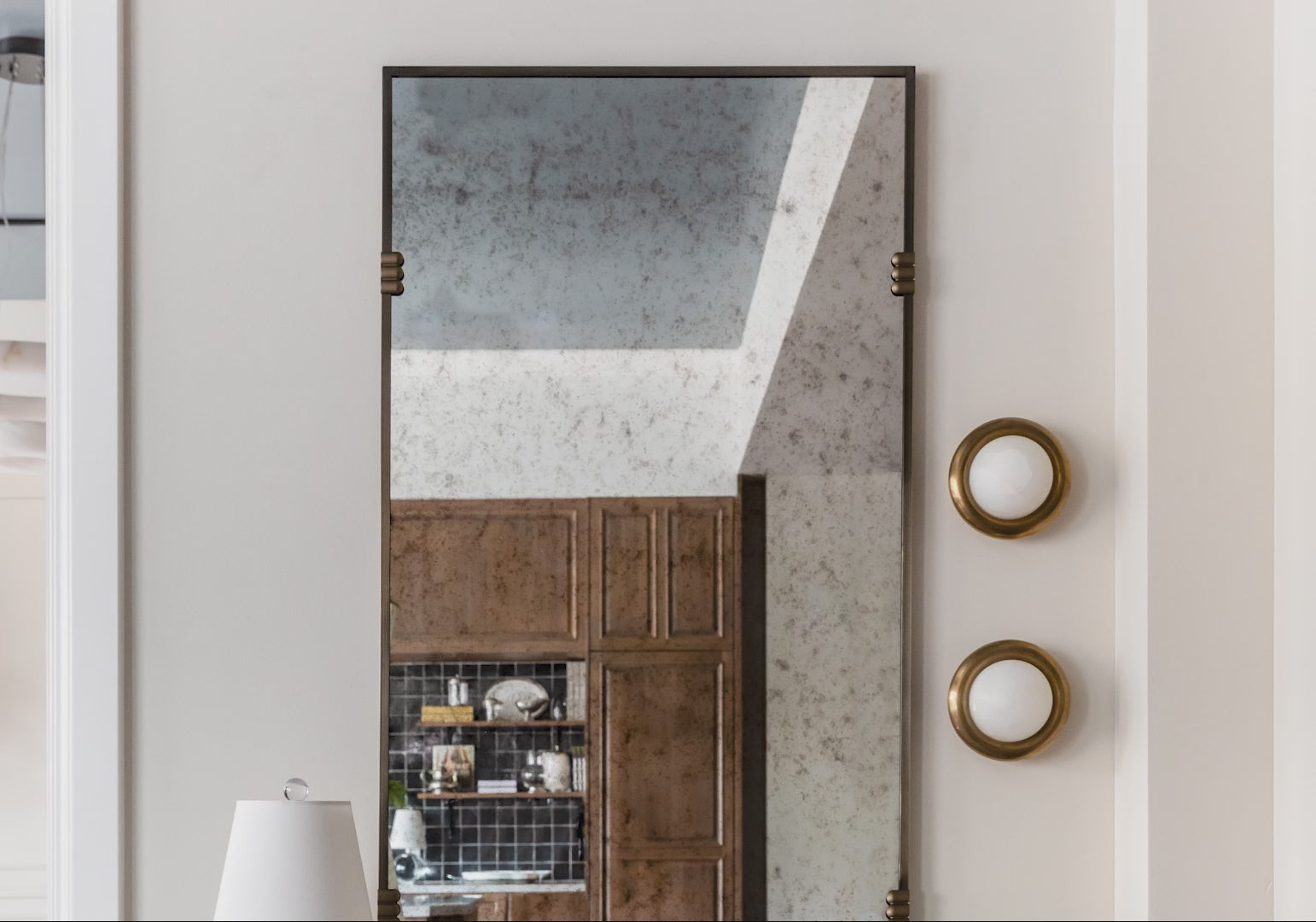 The Arlo Mirror features a beautiful antiqued mirror framed in darkened brass. Four knuckle accents adorn each side for an added touch of interest and dimension. Its gracious size styles perfectly in bedrooms, above consoles or vanities, and in hallways for a sophisticated design.