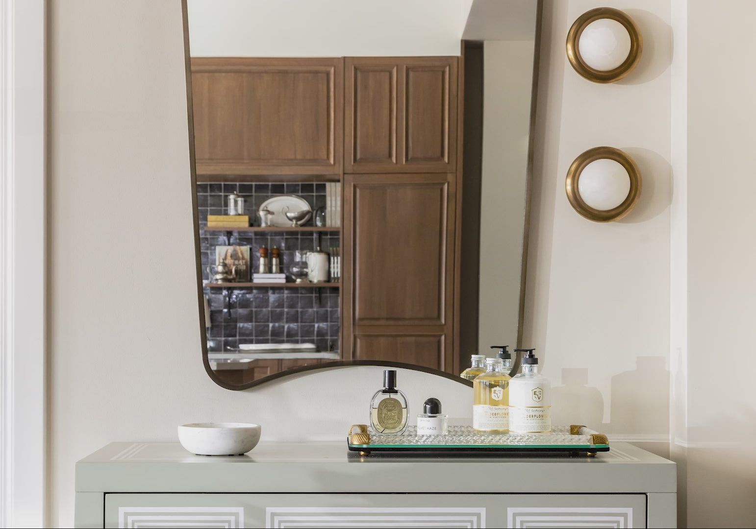 Love the brass lining around this mirror, it adds a moody yet sophisticated look, and the curved lines are a beautiful shape and add a unique look to your space.