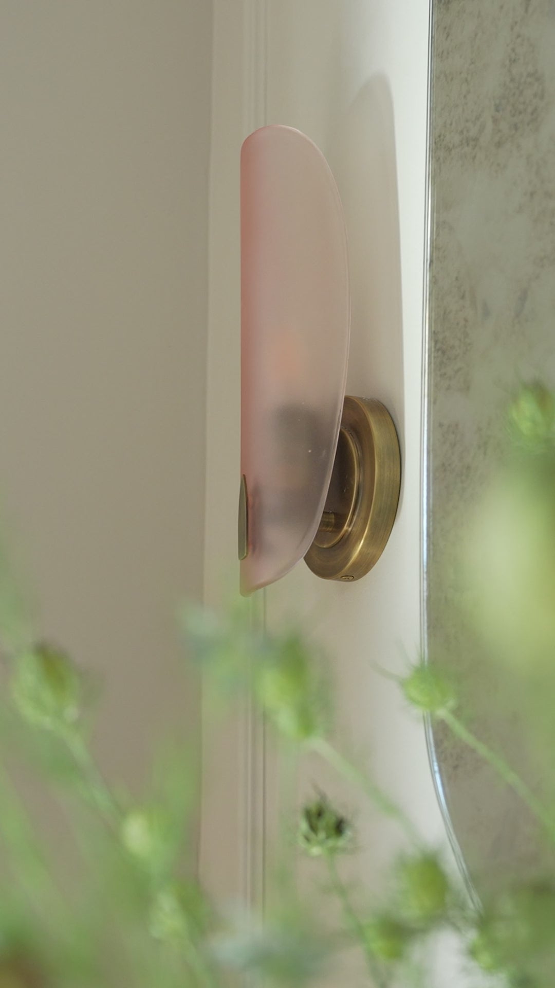 The Lulu Sconce glows with vintage charm. Beveled pink glass diffuses light into a soft, hazy warmth, while antique brass hardware lends timeless detail and elegance. Perfect on its own or in pairs beside a mirror, it adds character and sophistication to bedrooms, entryways, mantles, or powder baths.