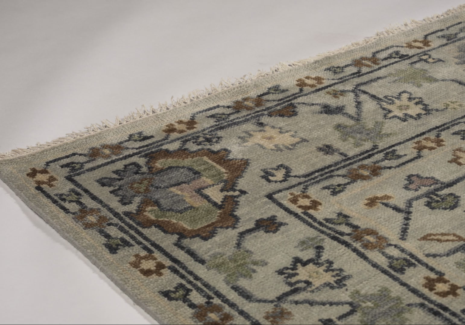 The Farah Rug is a hand-knotted Oushak, known to be more casual amongst knotted rugs. Full of all the best neutrals in a beautiful denim blue, it is perfectly versatile, styling well into bedrooms, family rooms, under kitchen tables, and living rooms. Its traditional yet relaxed motif gives an easy, comfortable depth and touch of brightness to any room.
