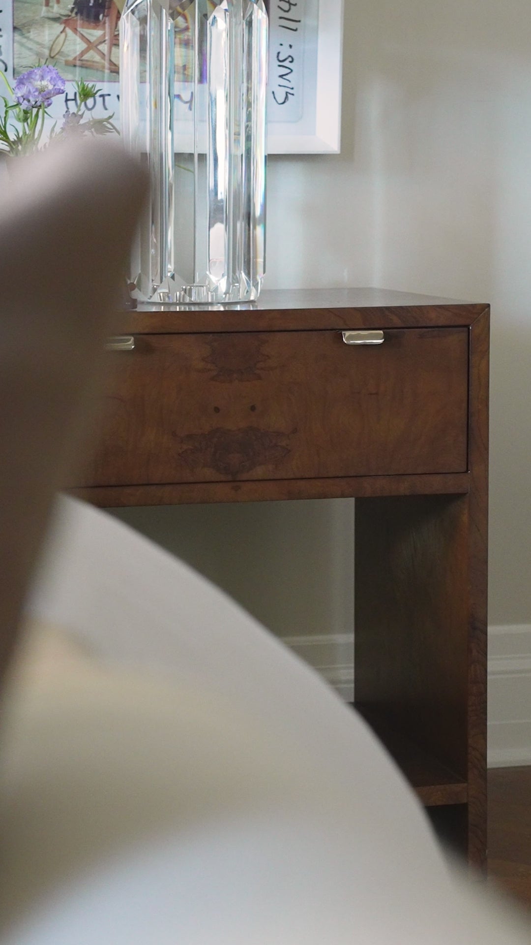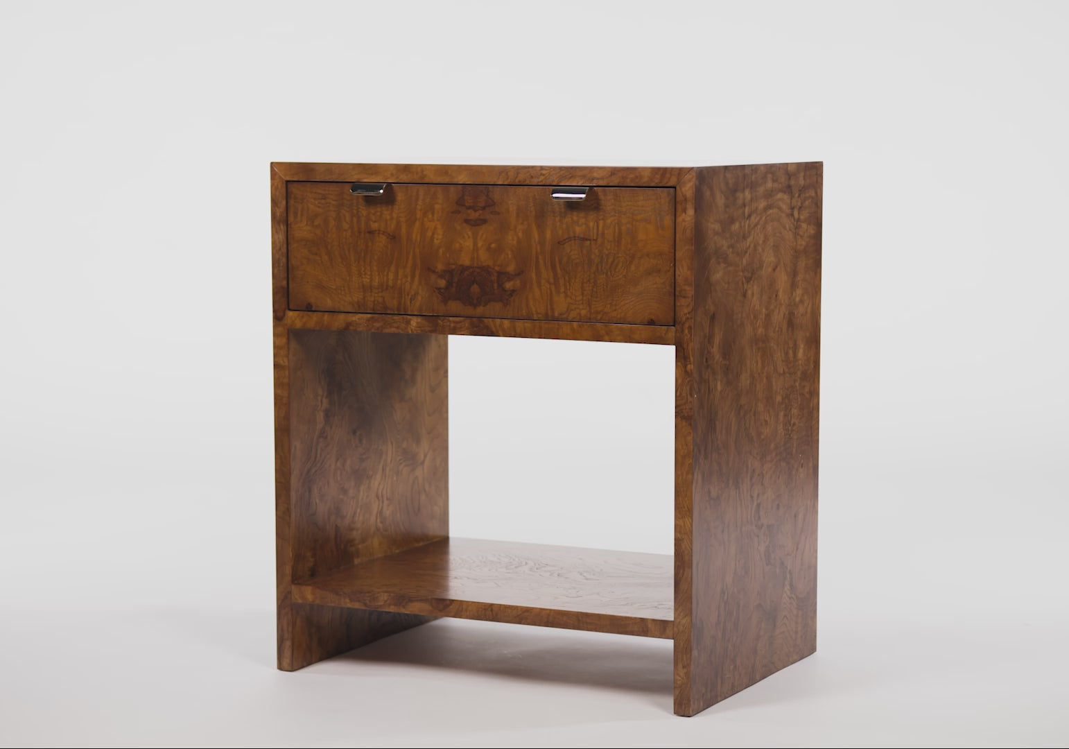 Crafted in richly figured burl wood, with polished nickel edge pulls for a touch of quiet luxury. With open and hidden storage it balances function with clean, architectural lines, bringing rich texture and timeless sophistication to the bedside.