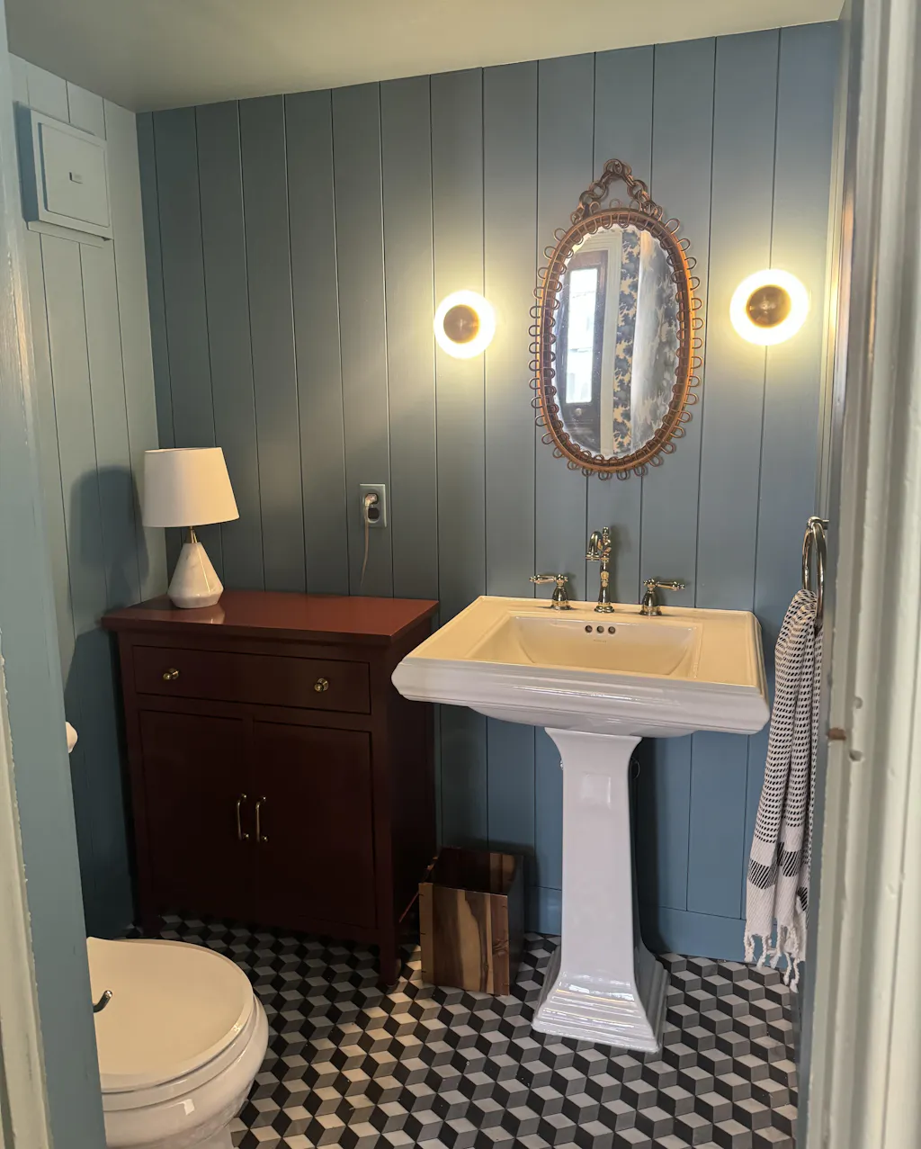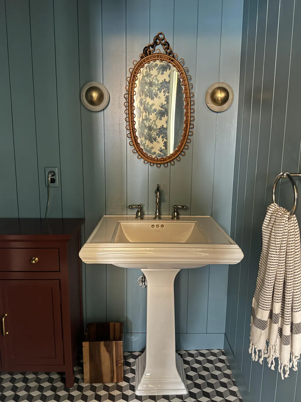 lifestyle photo of the ace sconce placed on the wall above some lit candles, next to a mirror.