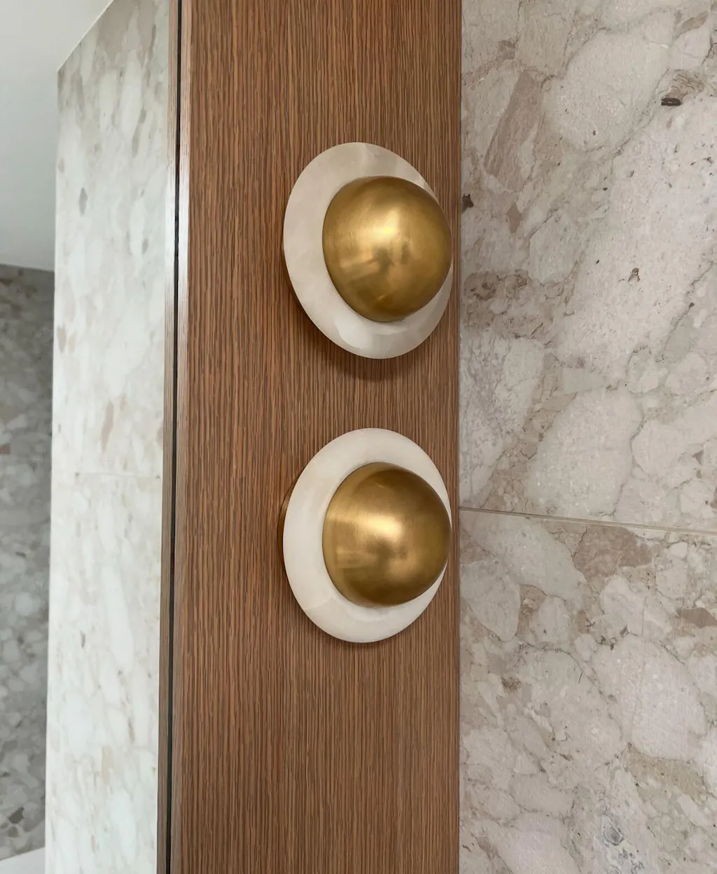 This sconce is a timeless addition with its chic, rounded form and versatile size. Showcasing an alabaster shade complemented by a striking unlacquered brass orb, its tasteful design styles well into bathrooms, hallways, and entryways.