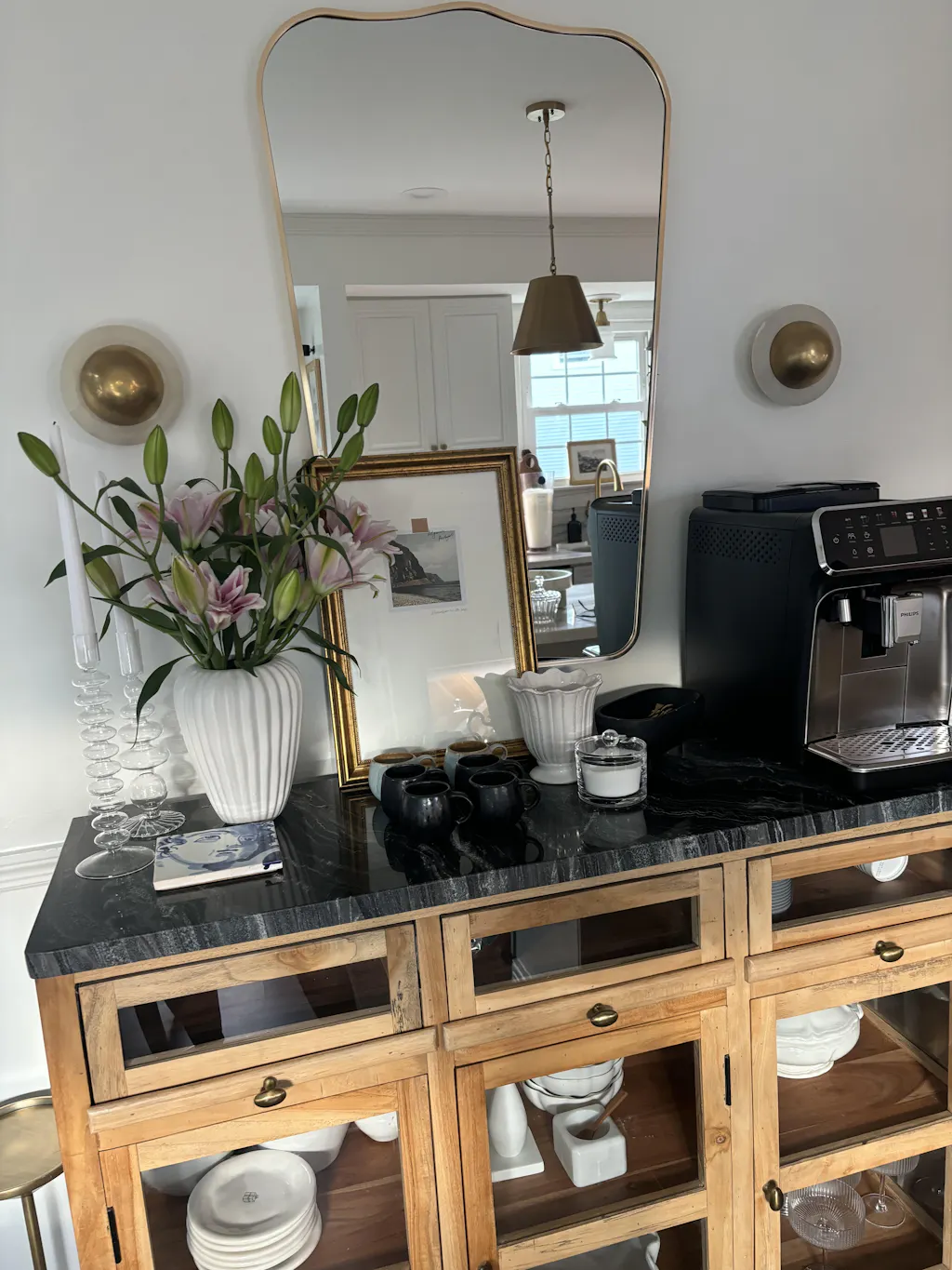 lifestyle photo of the ace sconce shown above a cabinet with dinnerware.