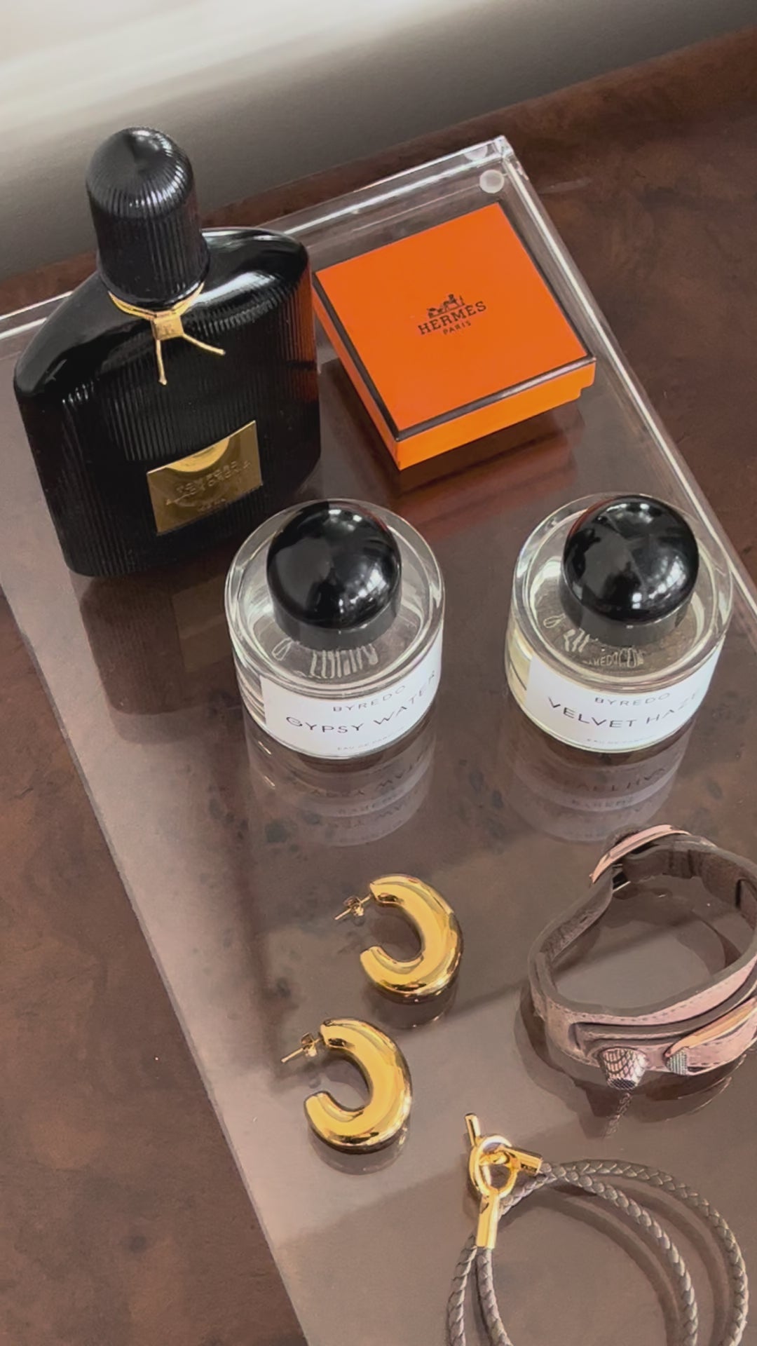 Arrived today and this is a gorgeous tray! Wow. Heavy with beautiful gold-corner details. I have been looking for a perfume tray that wasn’t too expensive but high quality and here it is!