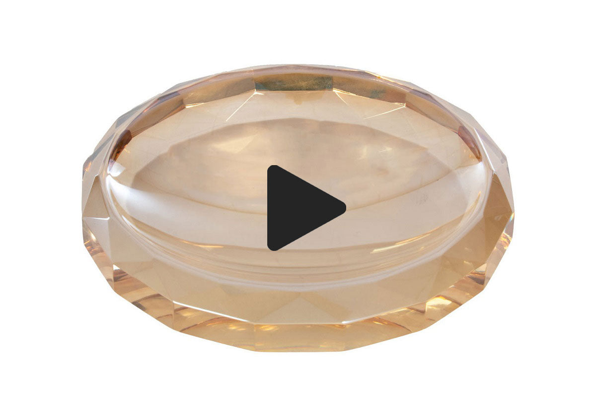This tasteful crystal dish lends timeless elegance with its versatile size and warm amber coloring. Its faceted exterior adds texture, beautifully contrasting with its smooth, rounded interior. A petite catchall, it effortlessly adds refinement to consoles, entry tables, and dressers.