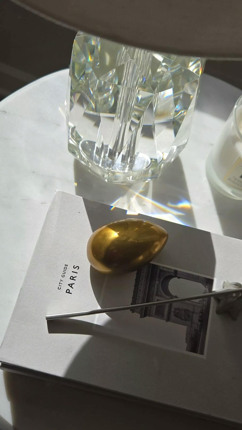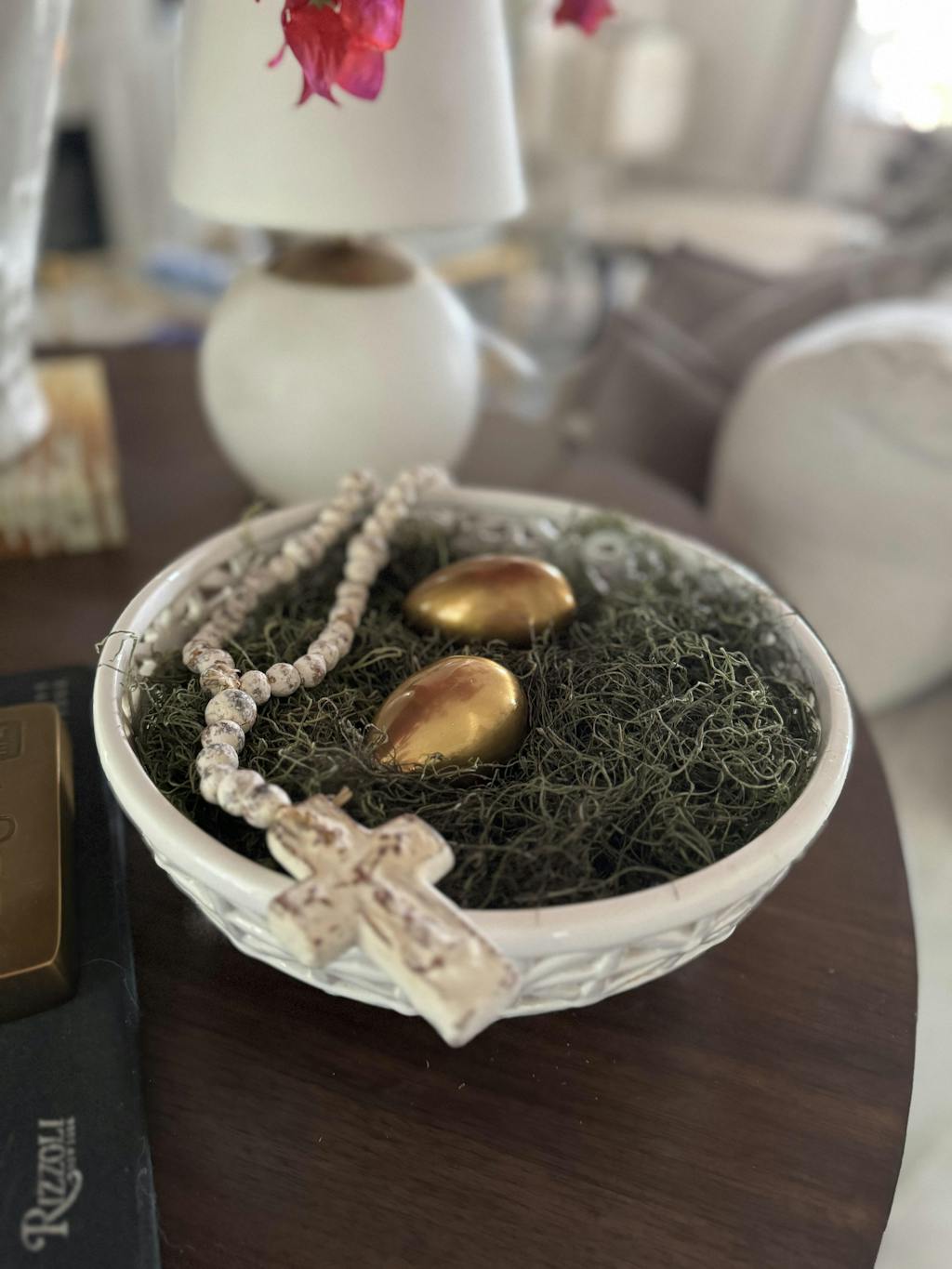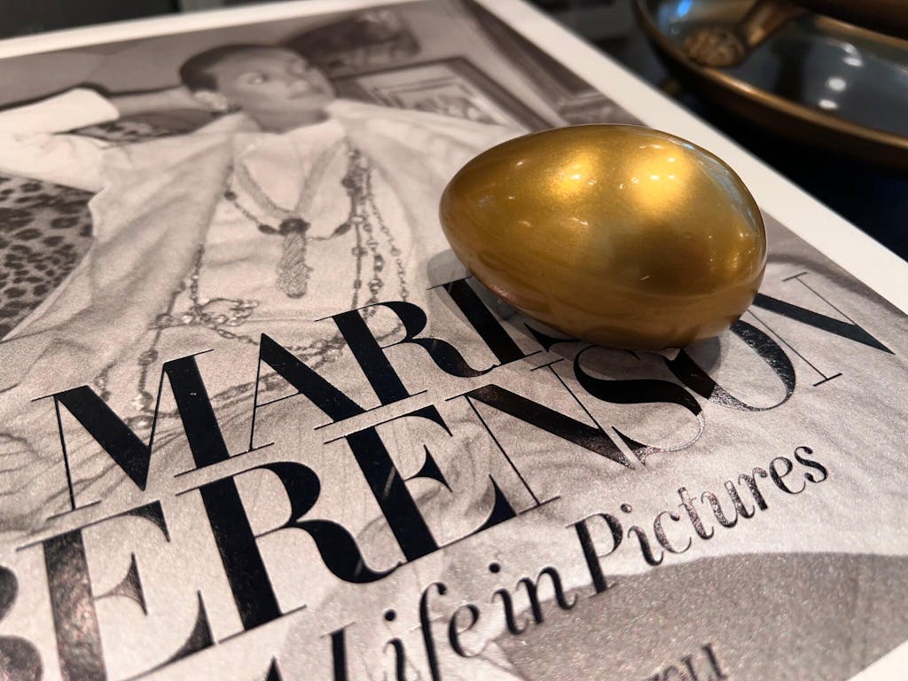 lifestyle photo of brass egg on a pile of books in a living room.