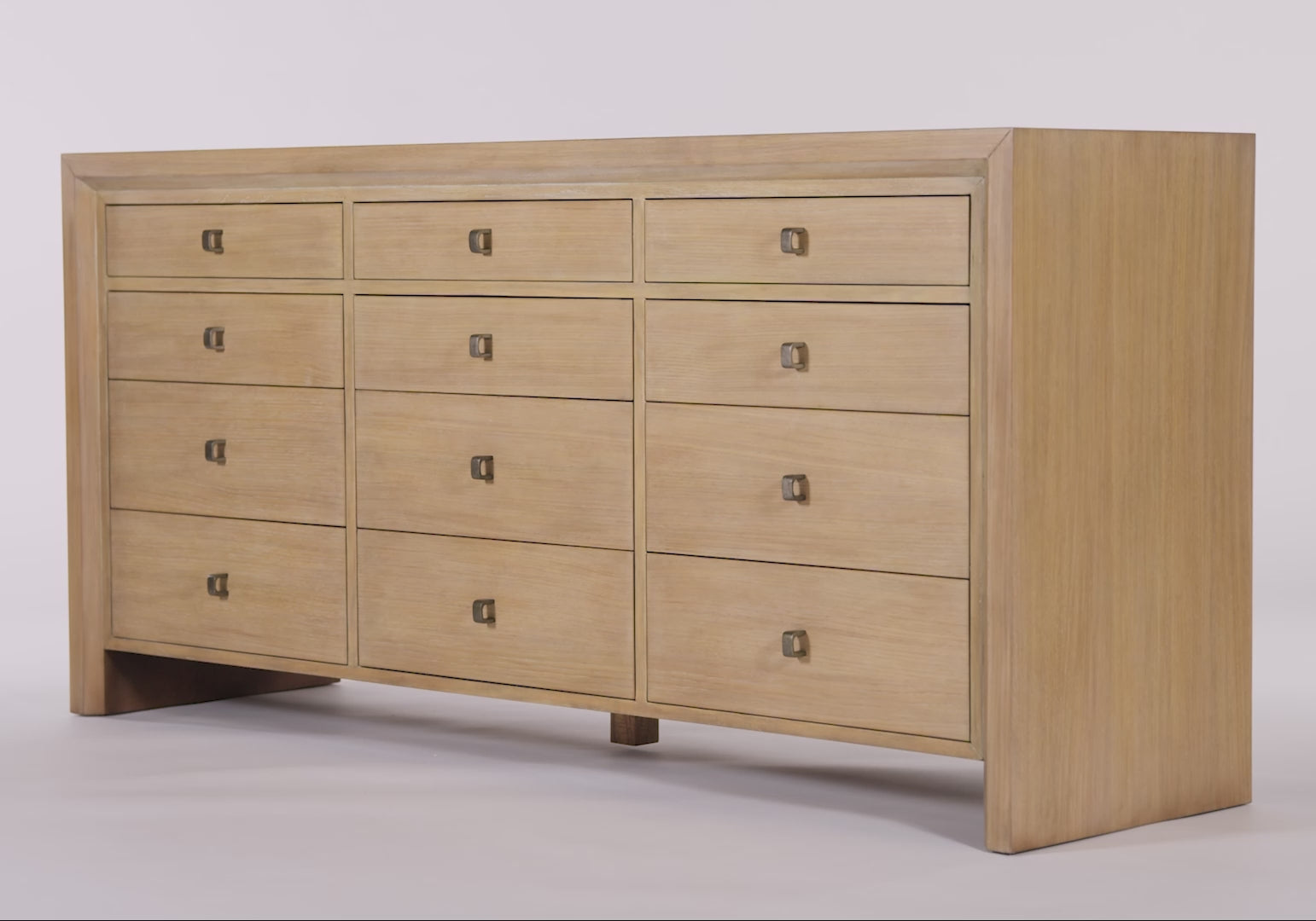 Millie features a beautiful waterfall design, beveled edge details, and mitered corners that wrap the top and continue to the floor. Twelve soft-close drawers with curved brass hardware provide effortless and ample hidden storage. Two solid feet give an airy look to its elongated form. Its light blonde cerused finish styles well into a variety of bedrooms. Also available in a rich hazelnut or a fresh cloud finish.