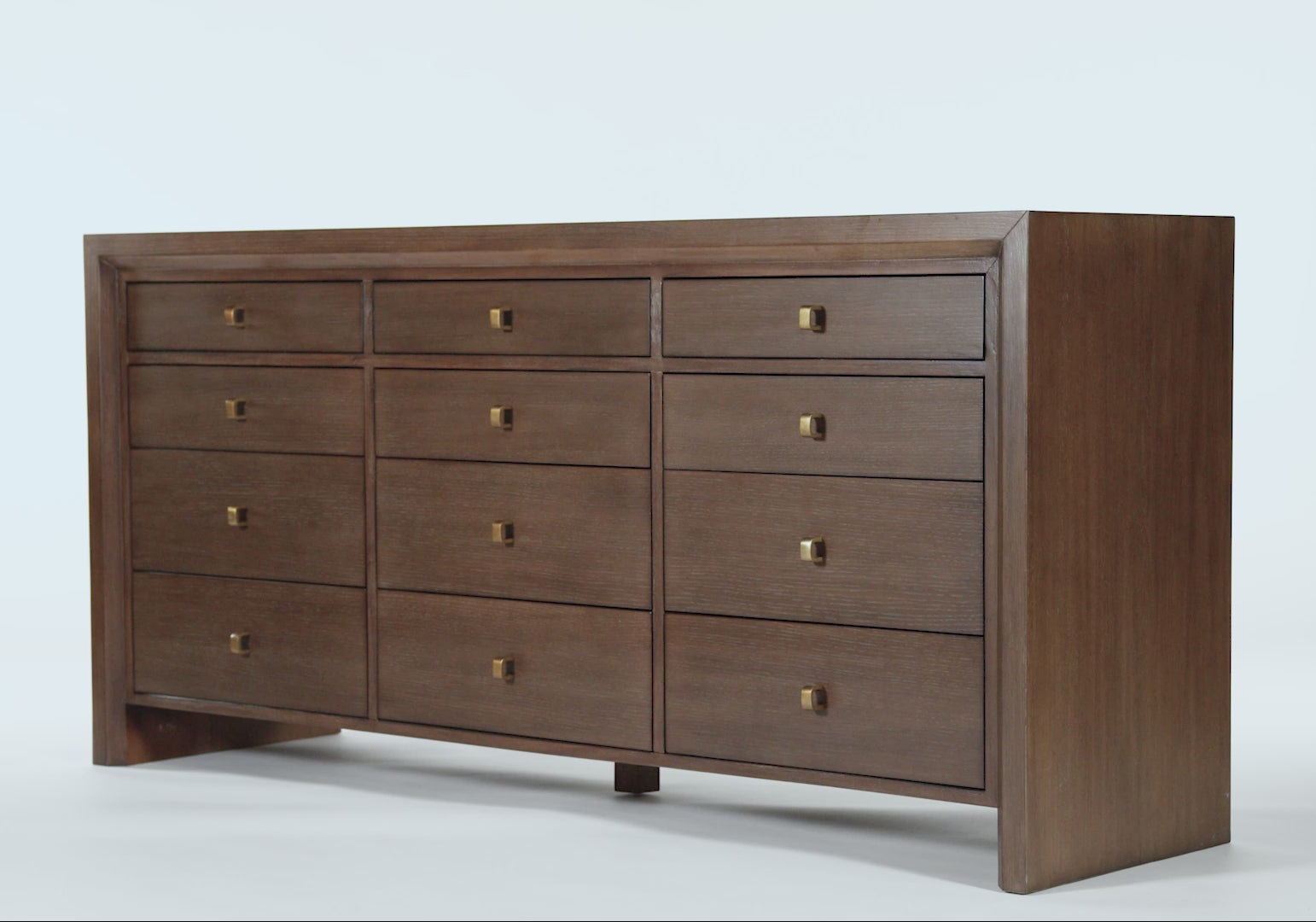 Millie features a beautiful waterfall design, beveled edge details, and mitered corners that wrap the top and continue to the floor. Twelve soft-close drawers with curved brass hardware provide effortless and ample hidden storage. Two solid feet give an airy look to its elongated form. Its light blonde cerused finish styles well into a variety of bedrooms. Also available in a creamy cloud or a light blonde finish.