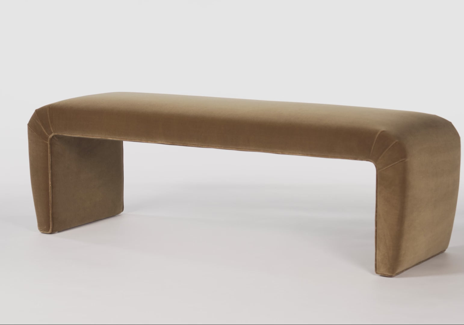 the phoebe bench is a luxurious italian cotton velvet chair, adding a touch of elegance and sophistication to any home. A soft brown colored velvet bench. The clean lines and sculptural form create a striking visual impact, while the curved edges offer a comfortable and inviting seat. Perfect for adding a pop of color and a touch of vintage flair to your living room, bedroom, or entryway.