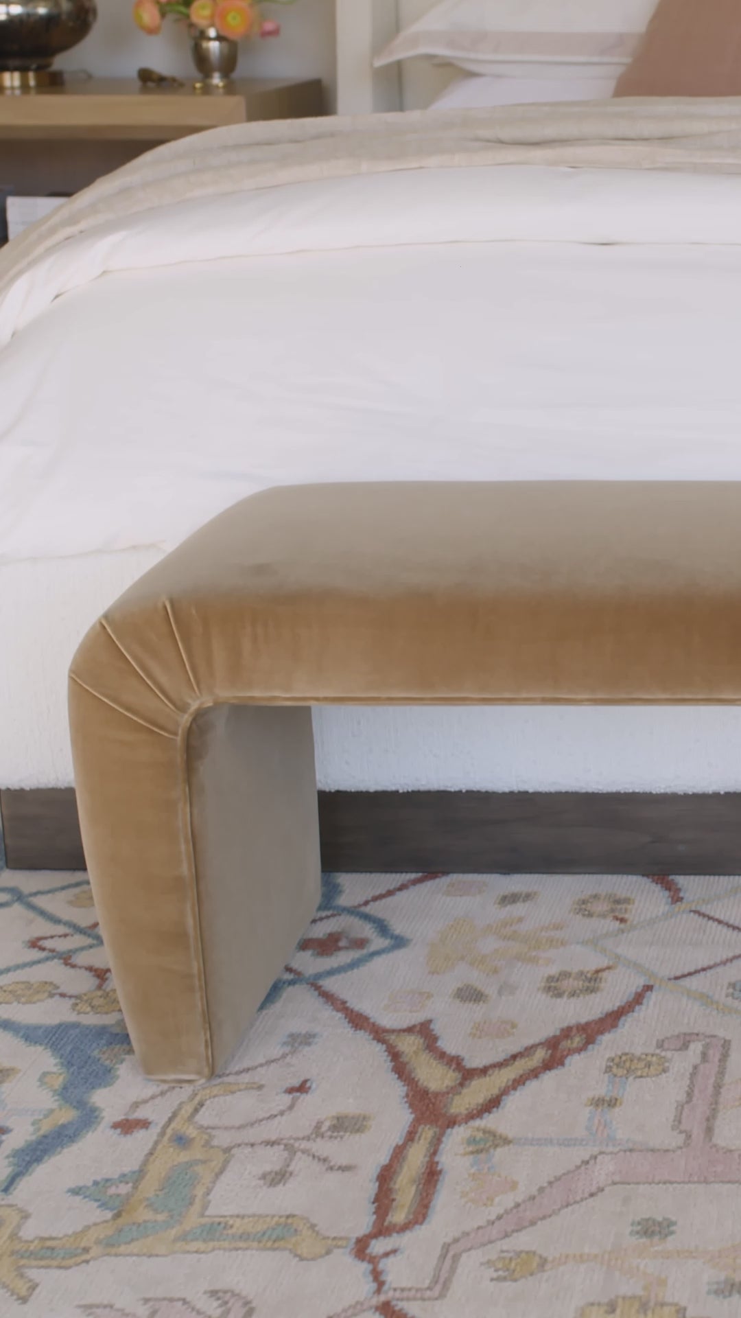 Inspired by vintage designs, the Phoebe Bench features a curved, fully upholstered form in the finest 100% Italian Cotton Velvet. Its rich, luxurious touch is elevated by tailored pleats, giving a striking waterfall look. Incredibly soft and beautiful, it styles well into bedrooms, hallways, and under entry consoles.
