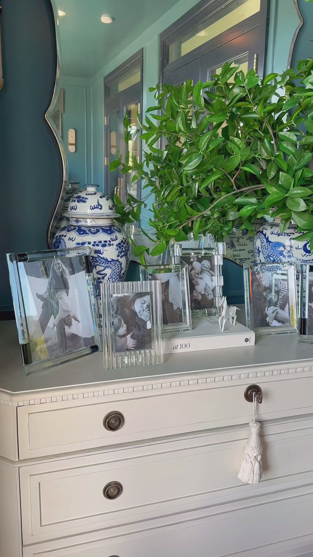 one large and one small black and crystal frames on a cabinet.