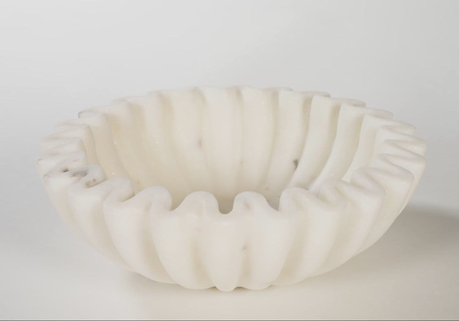 This stunning bowl lends a sophisticated touch with its tightly waved design and white marble form. Style on a tabletop with books and greenery for a textured, beautiful look.