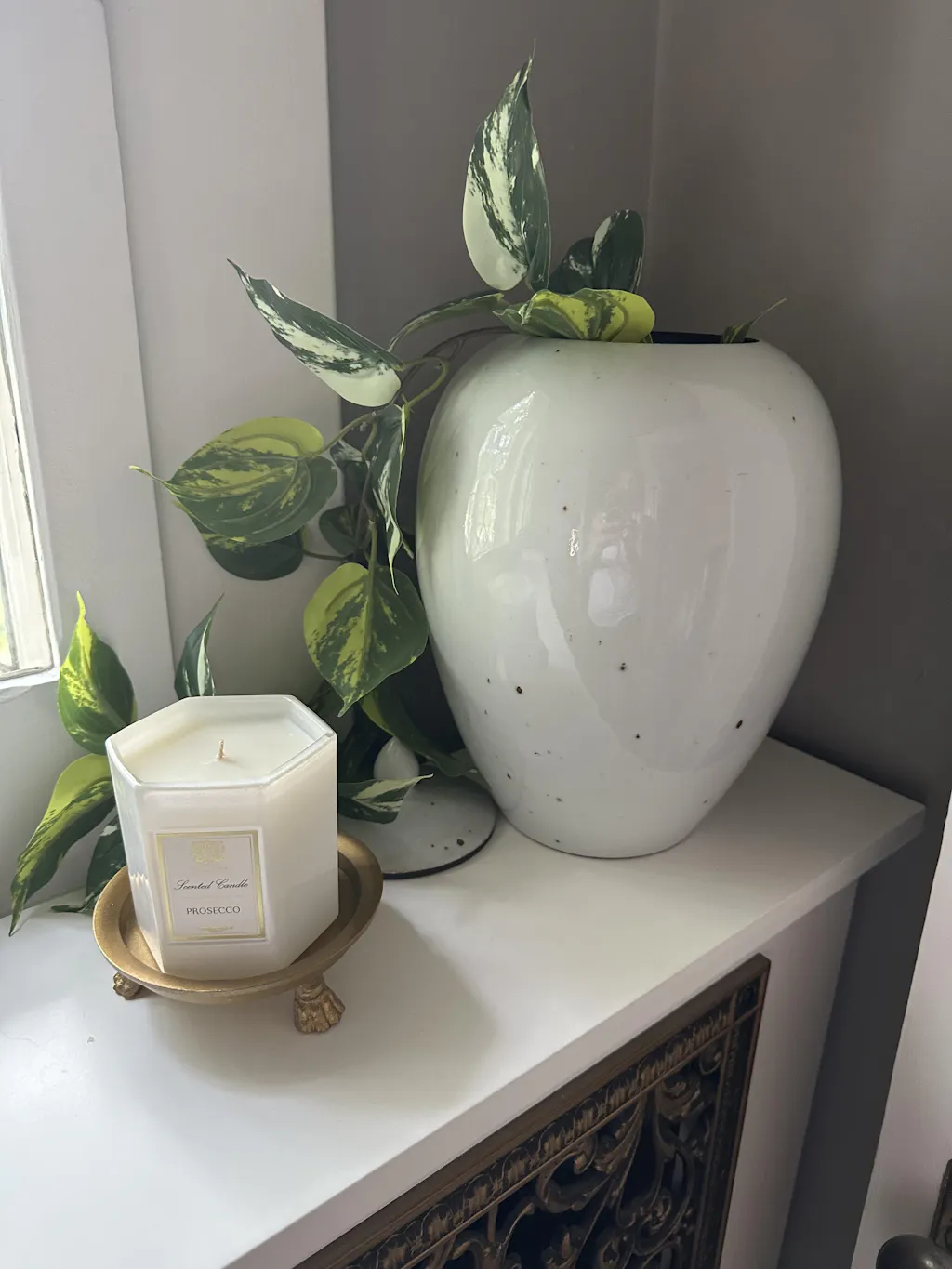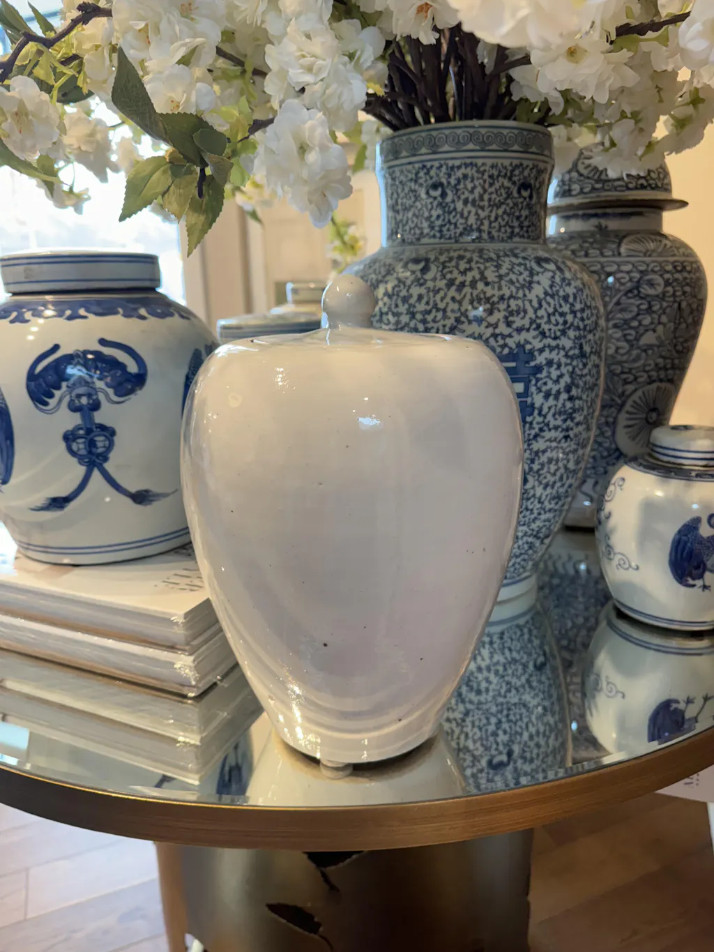 The Portia is an instant classic with its neutral white coloring accentuated by natural speckles and subtle horizontal lines. Its rounded form tapers slightly and is topped by a thin lid with a shapely finial, lending additional visual dimension.