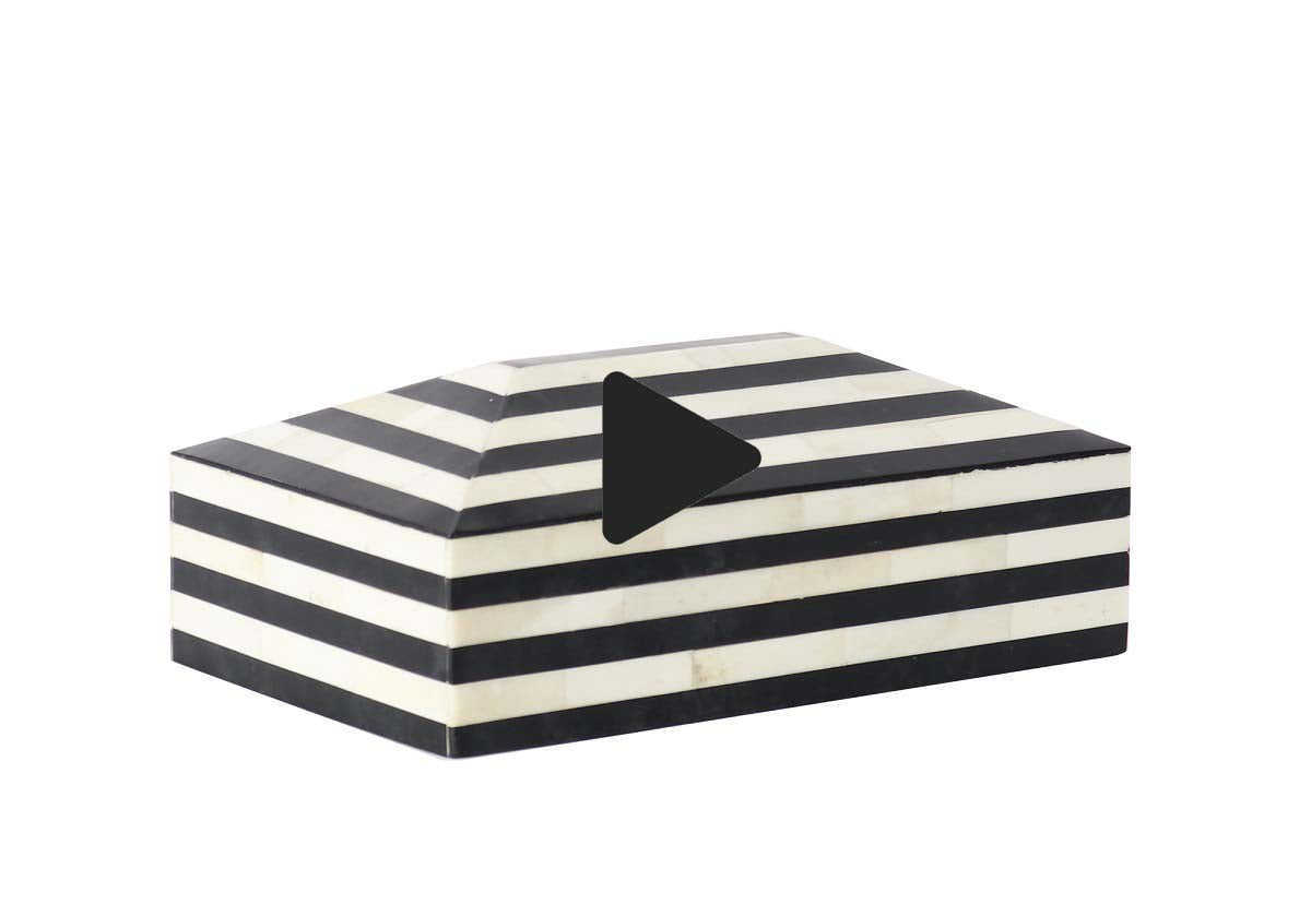 Create a visually dynamic style with this eye-catching bone box. It features a straight-line pattern in bold black and natural bone with a slightly peaked lid. It effortlessly stows electronics or trinkets while lending a sophisticated, cultured look.