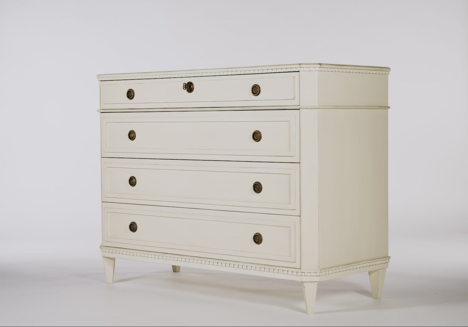The Estelle Chest makes an elegant statement with its generous size complemented by a slim top drawer with a functioning lock and key, and three large drawers with ring pulls in antiqued brass. A tasteful dentil moulding runs along the top and bottom for additional detailing. Beveled corners and a 45-degree tapered feet soften its look, styling easily into an entryway, hallway, music room, living room, dining room, or bedroom.