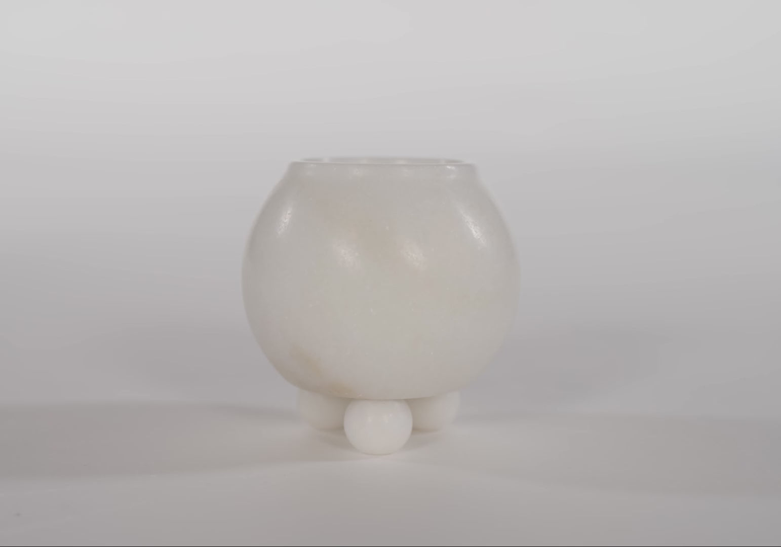 This striking marble container lends a chic, organic touch with its shapely, rounded form set on small bubble feet. Its natural veining adds luxurious visual texture, easily elevating any room with a high-fashion touch.