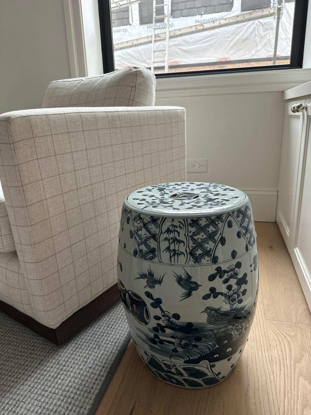 Beautiful piece! I love how the blue and white coloring is softer than most garden stools. It is a perfect end table for our family room!!