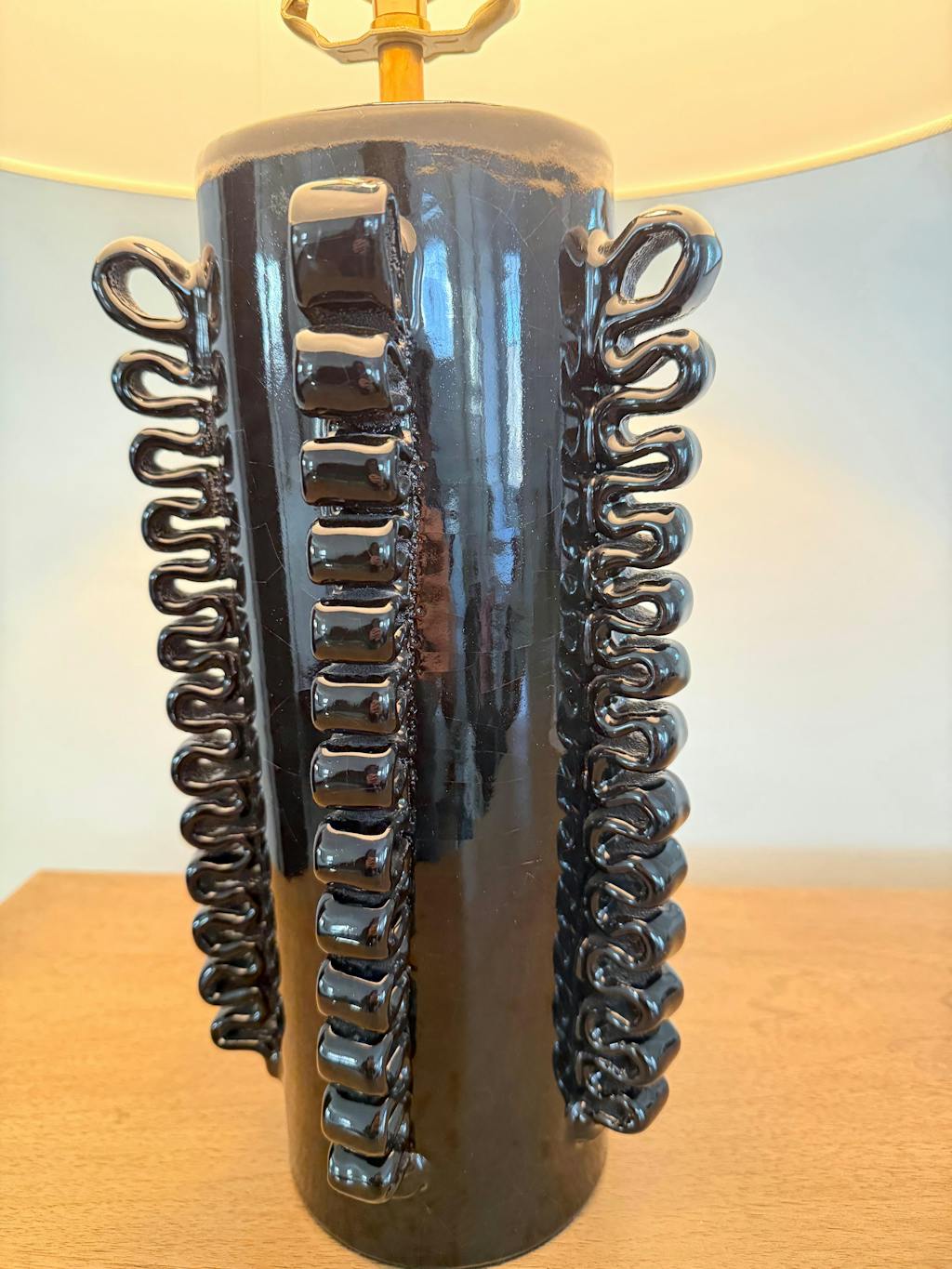 This lamp is a black subtle-crackle ceramic by Visual Comfort. I have two Visual Comfort lamps, both found via the curations here at Alice Lane. The quality is amazing. The on/off switch is a beautiful, substantial dimmer switch. Every aspect of this lamp is such high quality. Plus the design is so cool. Really adds an interesting element to my room!