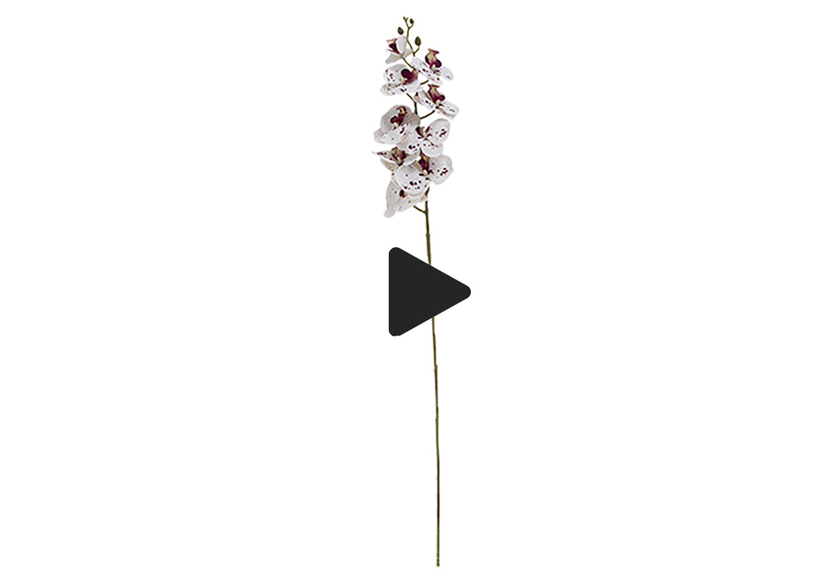 This elegant stem features blossoming white orchids with purple accents. Its elongated design lends subtle color and visual dimension, easily styling in large vases or jars for an everlasting look.